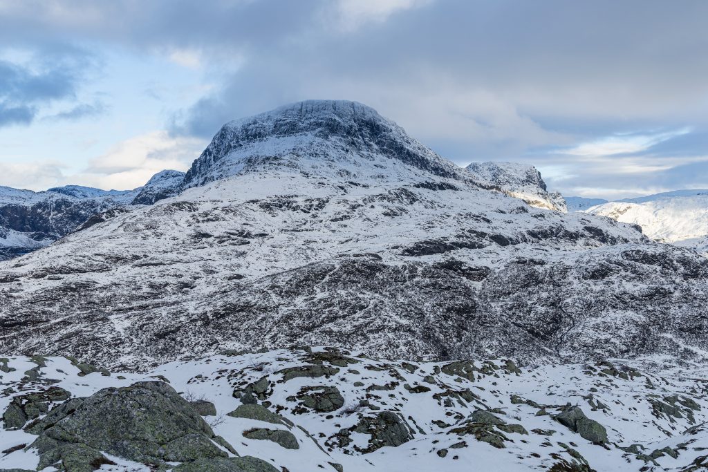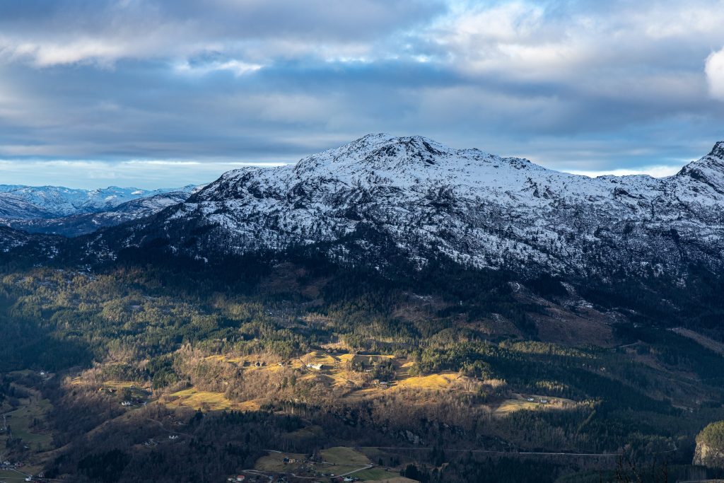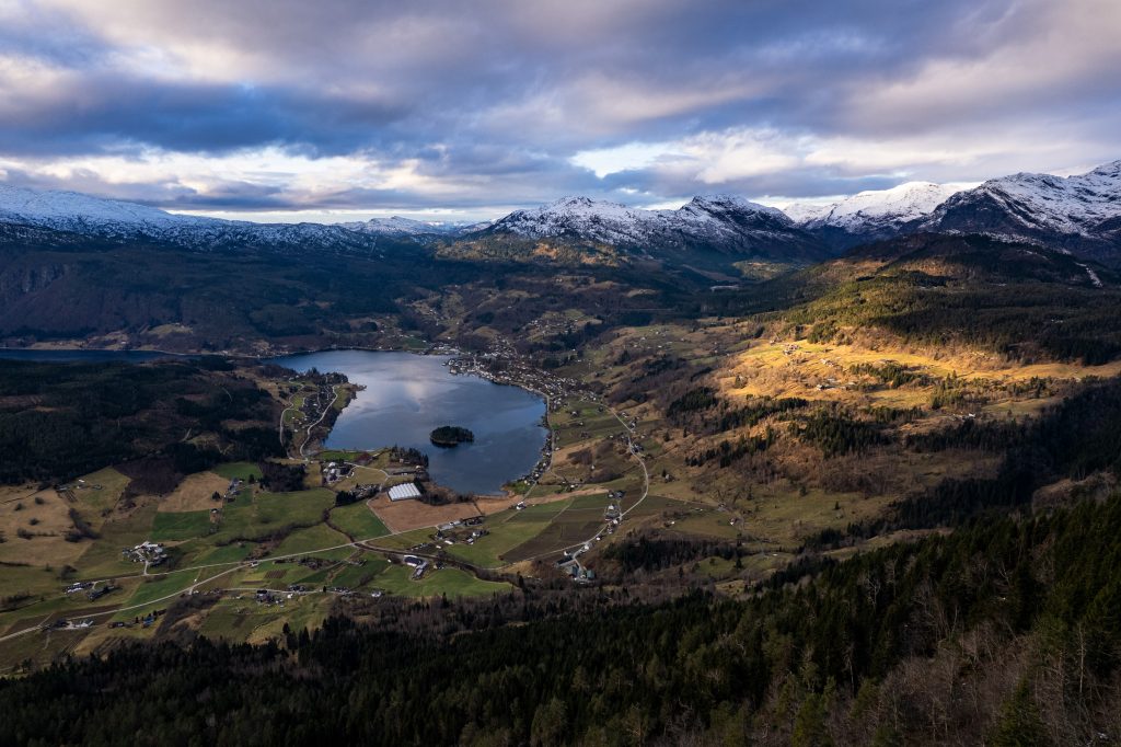 Na miejscu okazało się, że szczyty gór pokryte są już warstwą śniegu. No kto by się spodziewał. Helloł, mamy w końcu grudzień, trzeba było to przewidzieć wcześniej. Postanowiłem zatem, że wybiorę mniejszą górkę w Ulvik. Kinsarvik i Husedalen odpadło z potencjalnych wyborów już wcześniej bo ze względu na granice parku narodowego, nie można było tam latać dronem.
