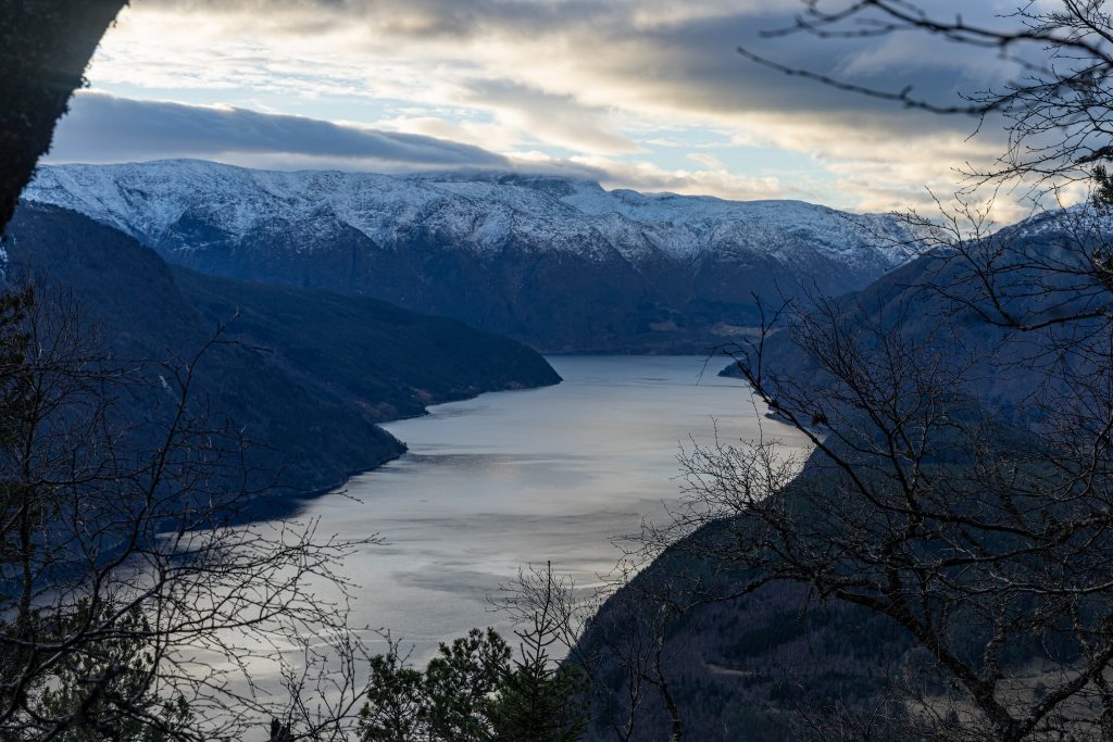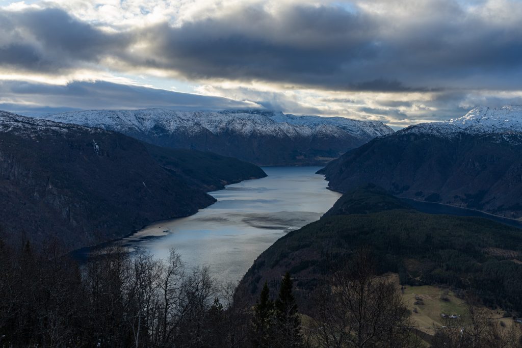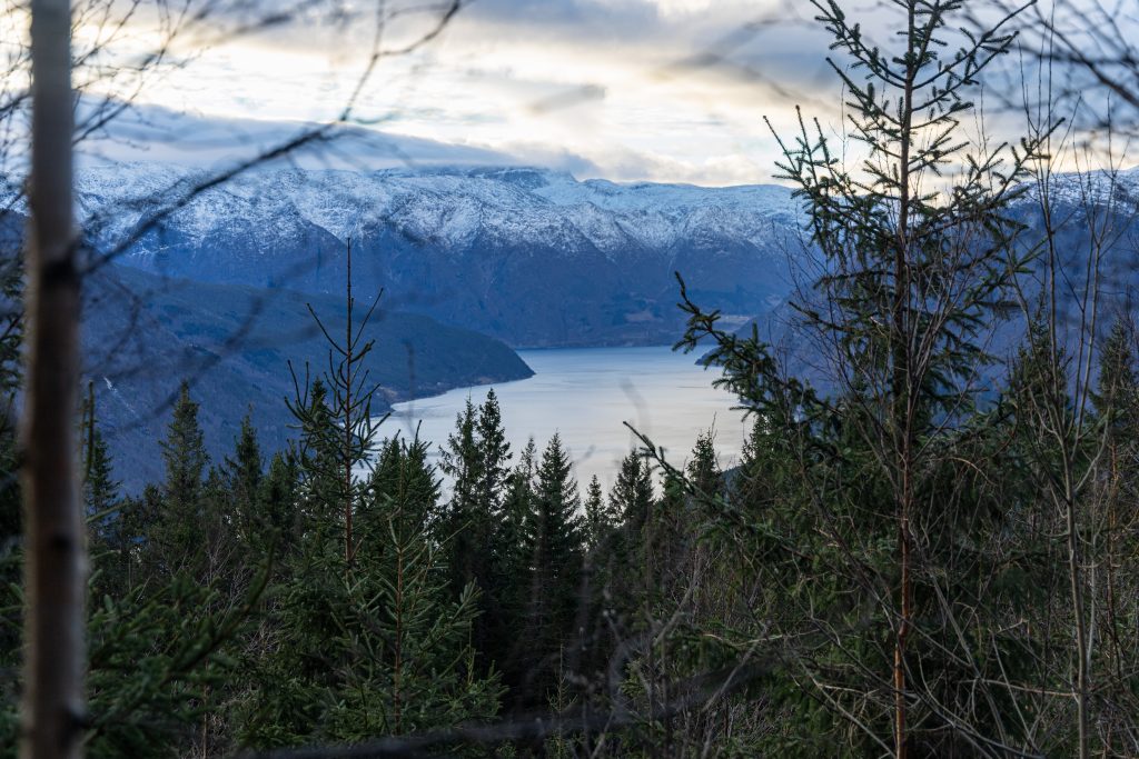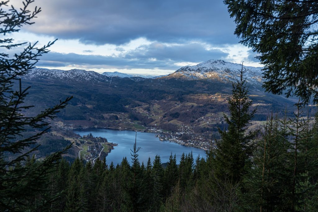 W końcu, udało mi się wejść wyżej. Tam, gdzie kończył się las. Na bardziej otwartą przestrzeń. Za plecami rozciągał się taki widok, że aż dech zapierało. Miałem przed oczami ciągnący się w dal Osafjorden, który łączył się gdzieś tam dalej z Hardangerfjordem. Po obu stronach tej wodnej wstęgi wznosiły się strome zbocza gór, pokryte z wierzchu warstwą śniegu. A w dole przycupnięte w zatoce Ulvikafjorden miasteczko Ulvik. Coś pięknego.