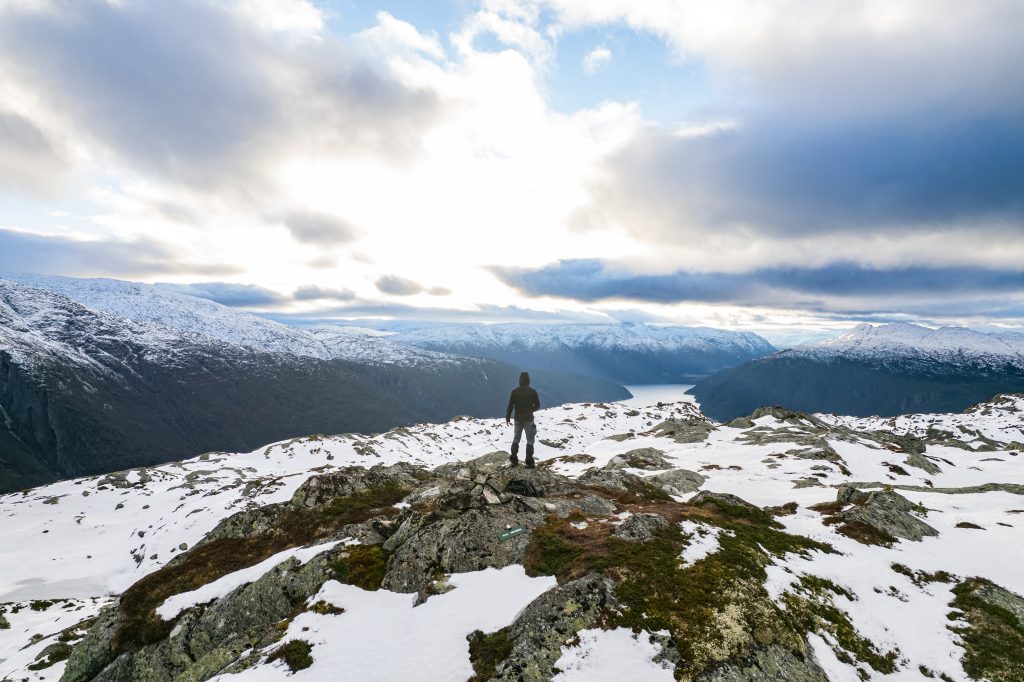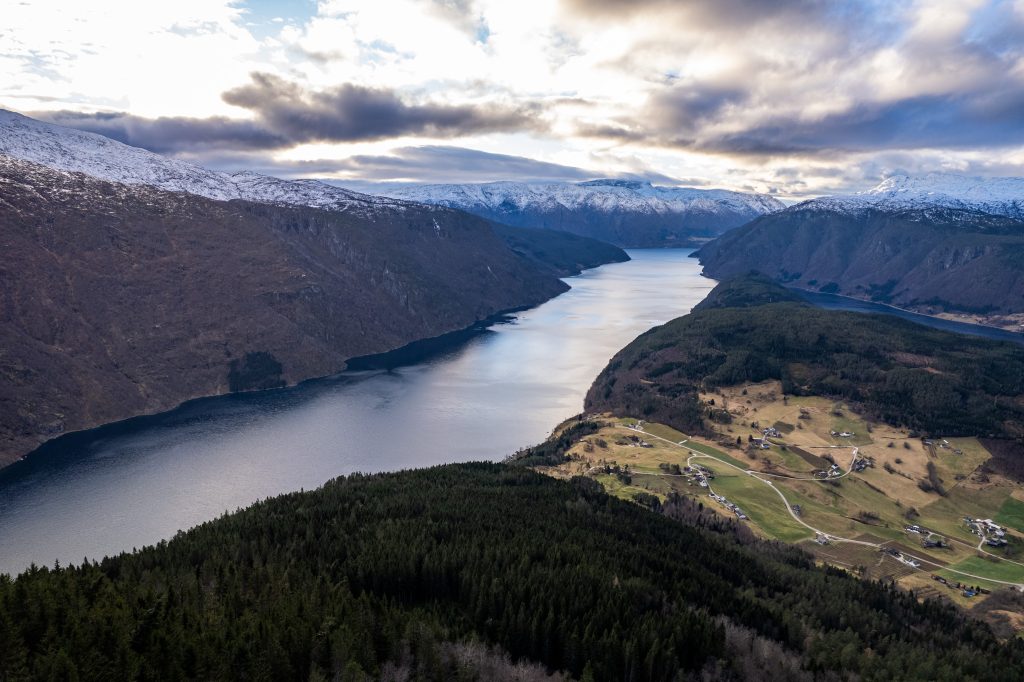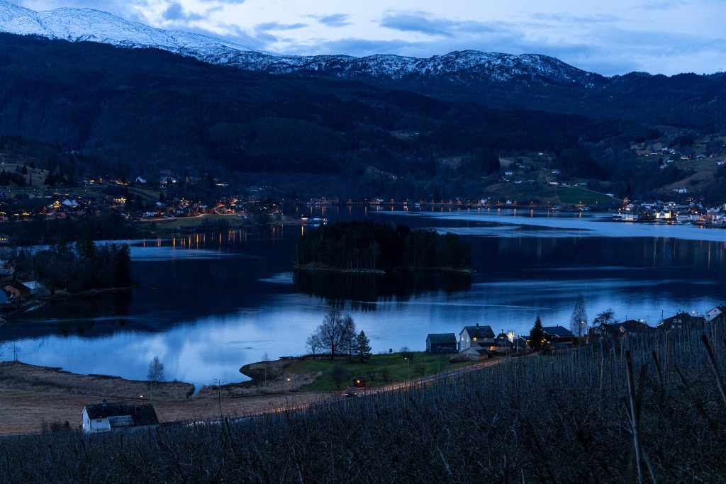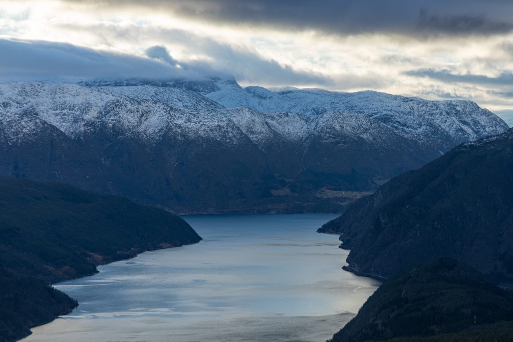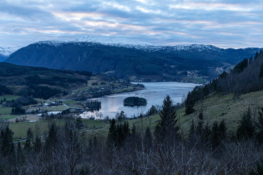 W końcu, udało mi się wejść wyżej. Tam, gdzie kończył się las. Na bardziej otwartą przestrzeń. Za plecami rozciągał się taki widok, że aż dech zapierało. Miałem przed oczami ciągnący się w dal Osafjorden, który łączył się gdzieś tam dalej z Hardangerfjordem. Po obu stronach tej wodnej wstęgi wznosiły się strome zbocza gór, pokryte z wierzchu warstwą śniegu. A w dole przycupnięte w zatoce Ulvikafjorden miasteczko Ulvik. Coś pięknego.