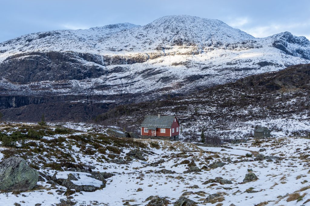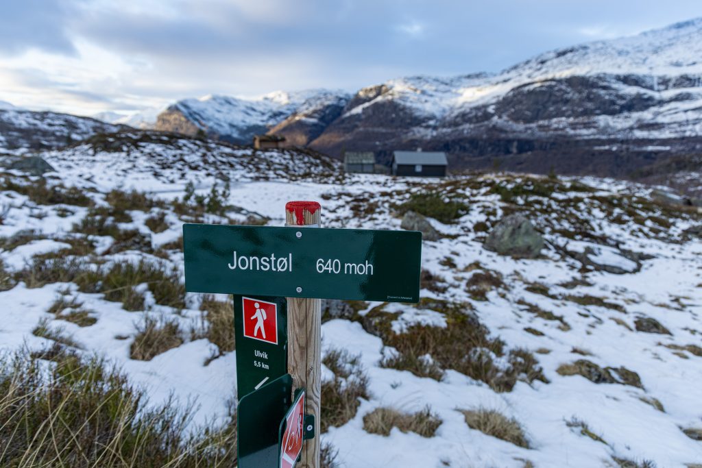 W międzyczasie zorientowałem się, że robi się już późno. Było w okolicach pierwszej po południu a jak wiadomo w grudniu dni są ciut krótsze. Miałem jeszcze co prawda trochę czasu przed zachodem słońca (i w razie czego latarkę w plecaku) ale trzeba było się pośpieszyć. Następny etap wędrówki to marsz w śniegu i zejście do Jonstøl. Jest to jak myślę dawne gospodarstwo, przekształcone w domki wypoczynkowe. Nie zamierzałem wracać tą samą trasą. Przedzieranie się ponownie przez te wszystkie zwalone drzewa trochę mnie przerażało. Od Jonstøl biegła ścieżka bezpośrednio w dół, w kierunku Ulvik, i taki też był mój pierwotny plan wędrówki. Zrobić taką pętlę. Nie zatrzymywałem się więc tylko szybko zacząłem schodzić.