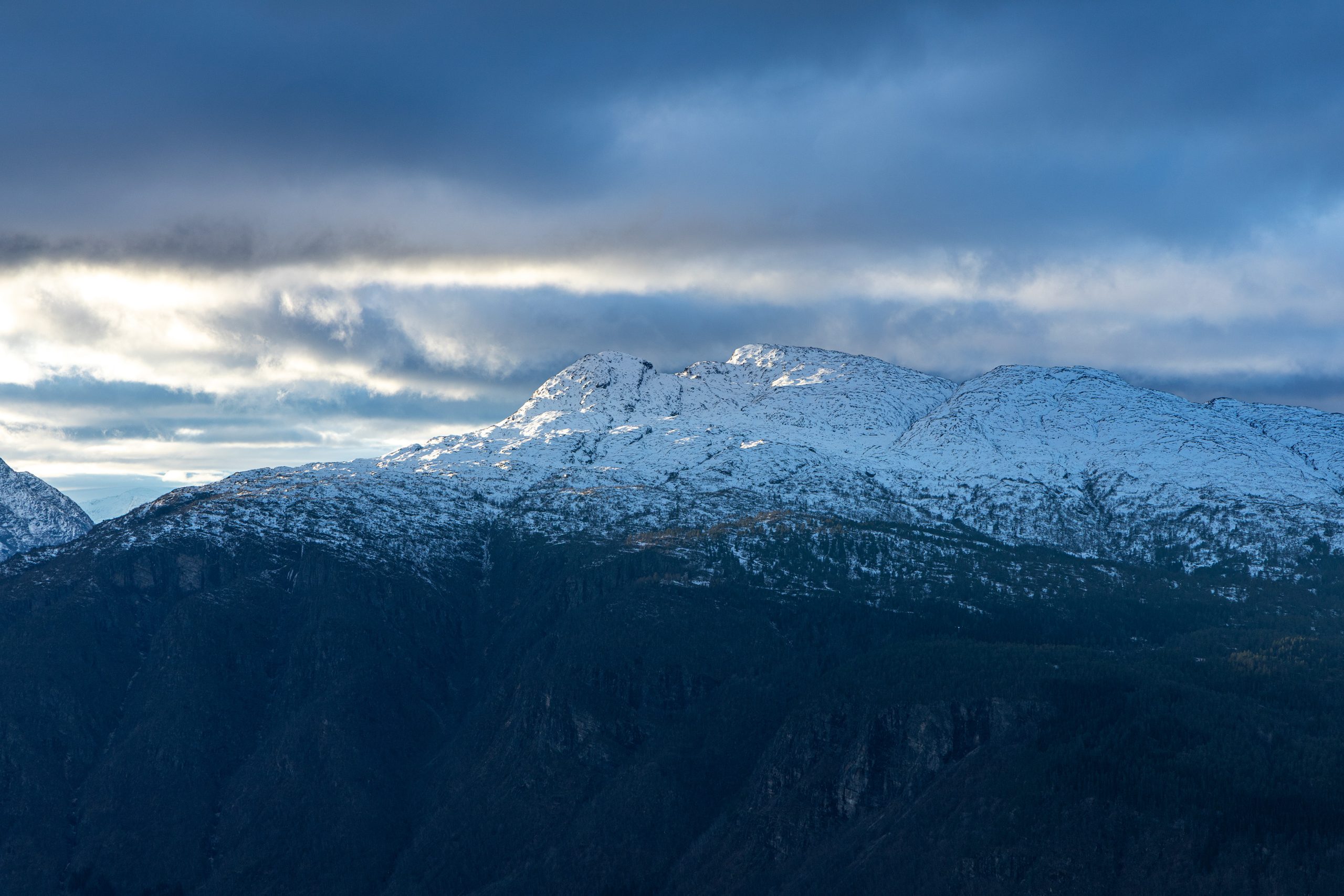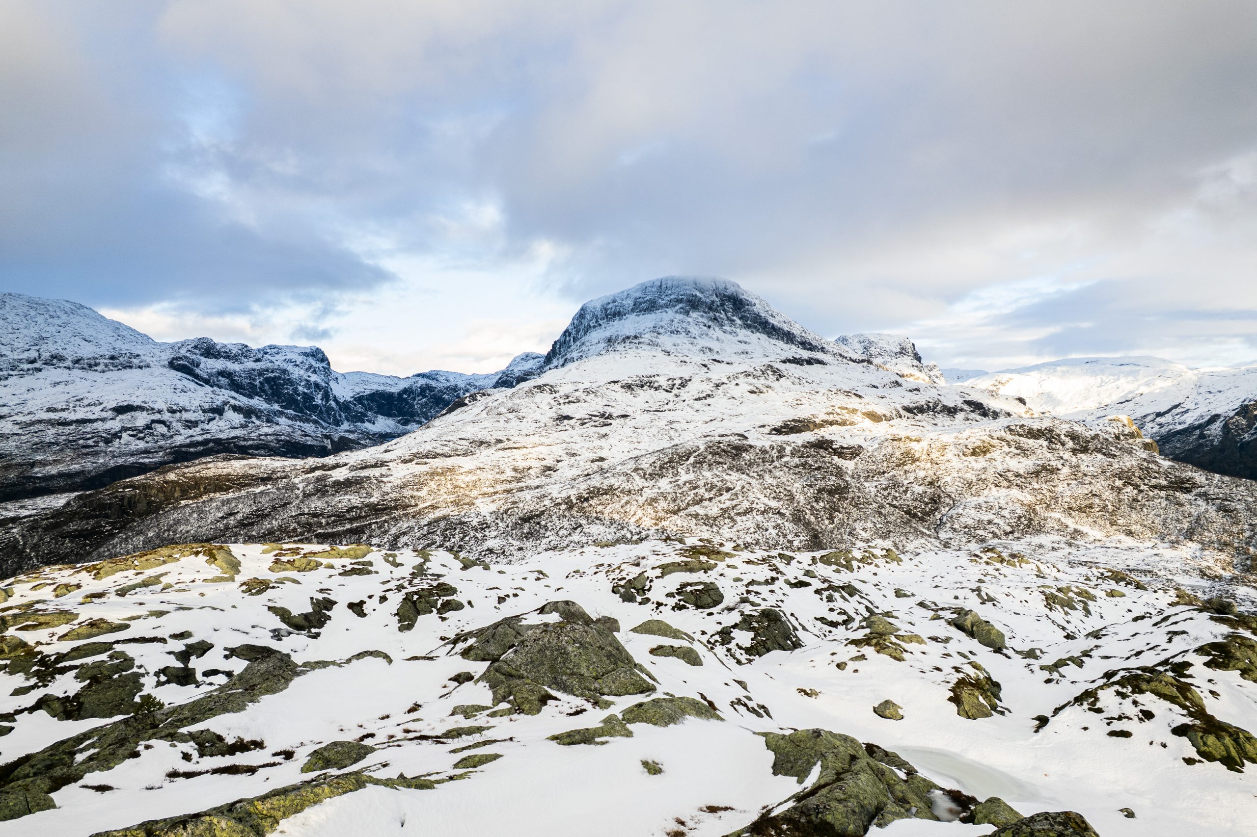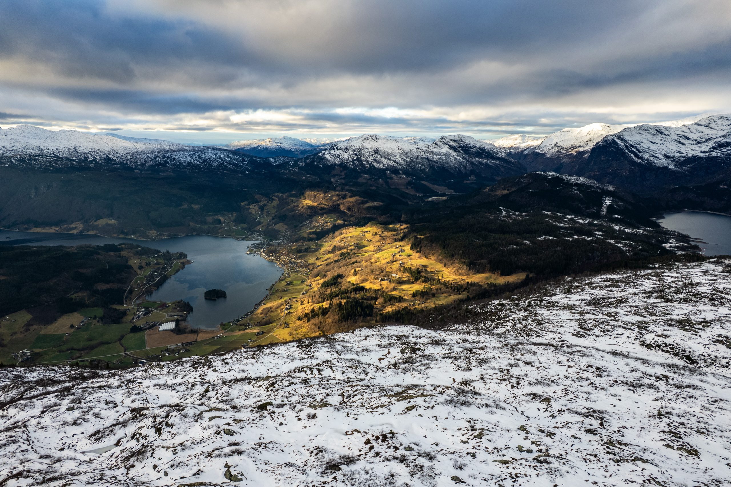 Na miejscu okazało się, że szczyty gór pokryte są już warstwą śniegu. No kto by się spodziewał. Helloł, mamy w końcu grudzień, trzeba było to przewidzieć wcześniej. Postanowiłem zatem, że wybiorę mniejszą górkę w Ulvik. Kinsarvik i Husedalen odpadło z potencjalnych wyborów już wcześniej bo ze względu na granice parku narodowego, nie można było tam latać dronem.