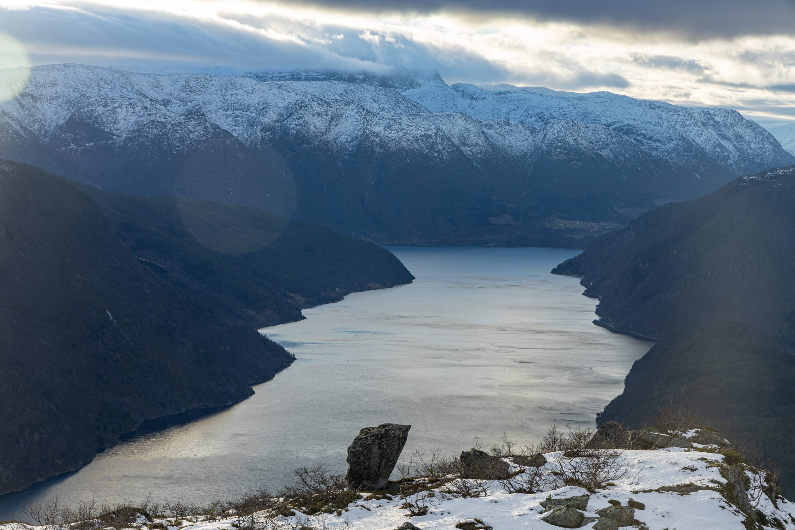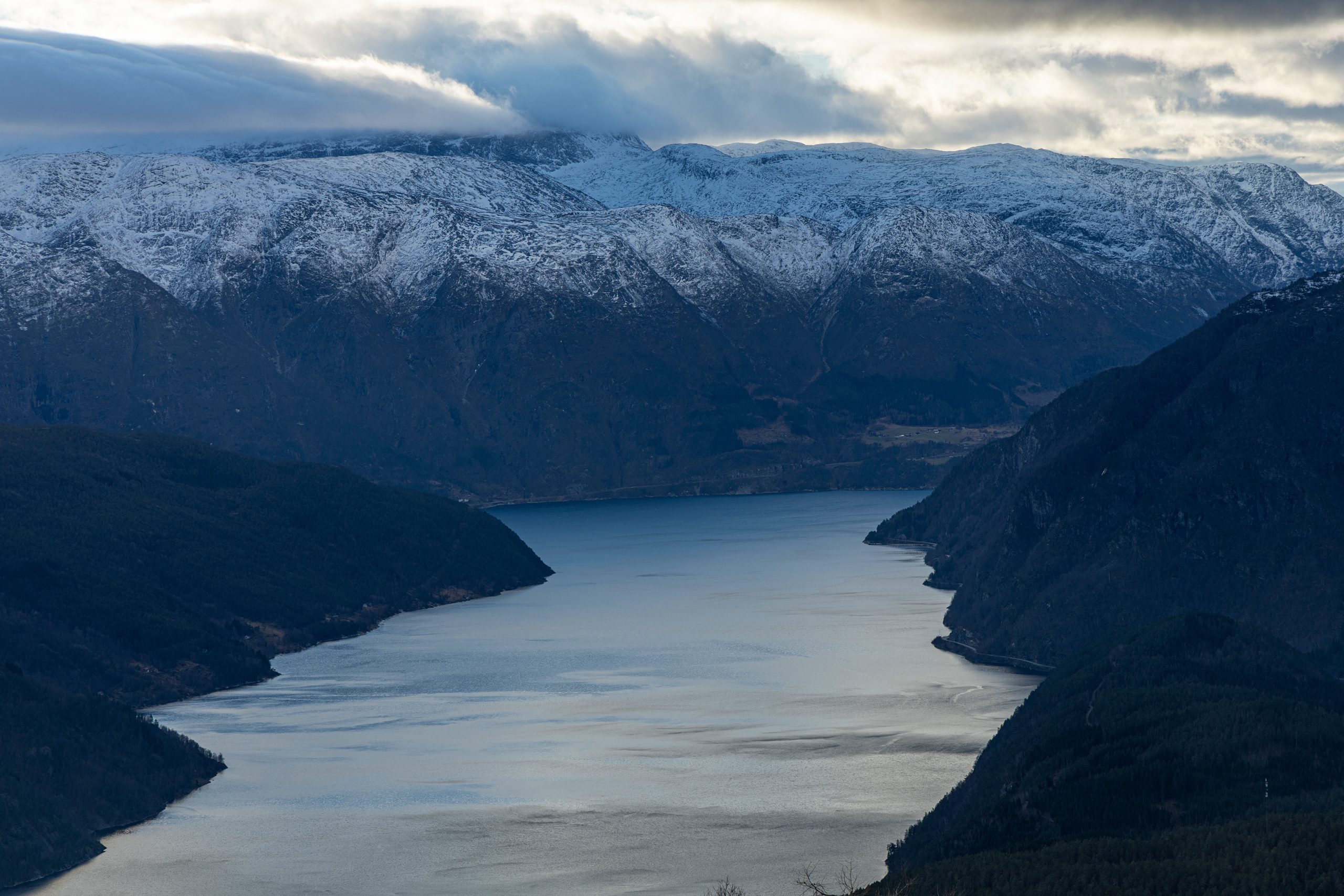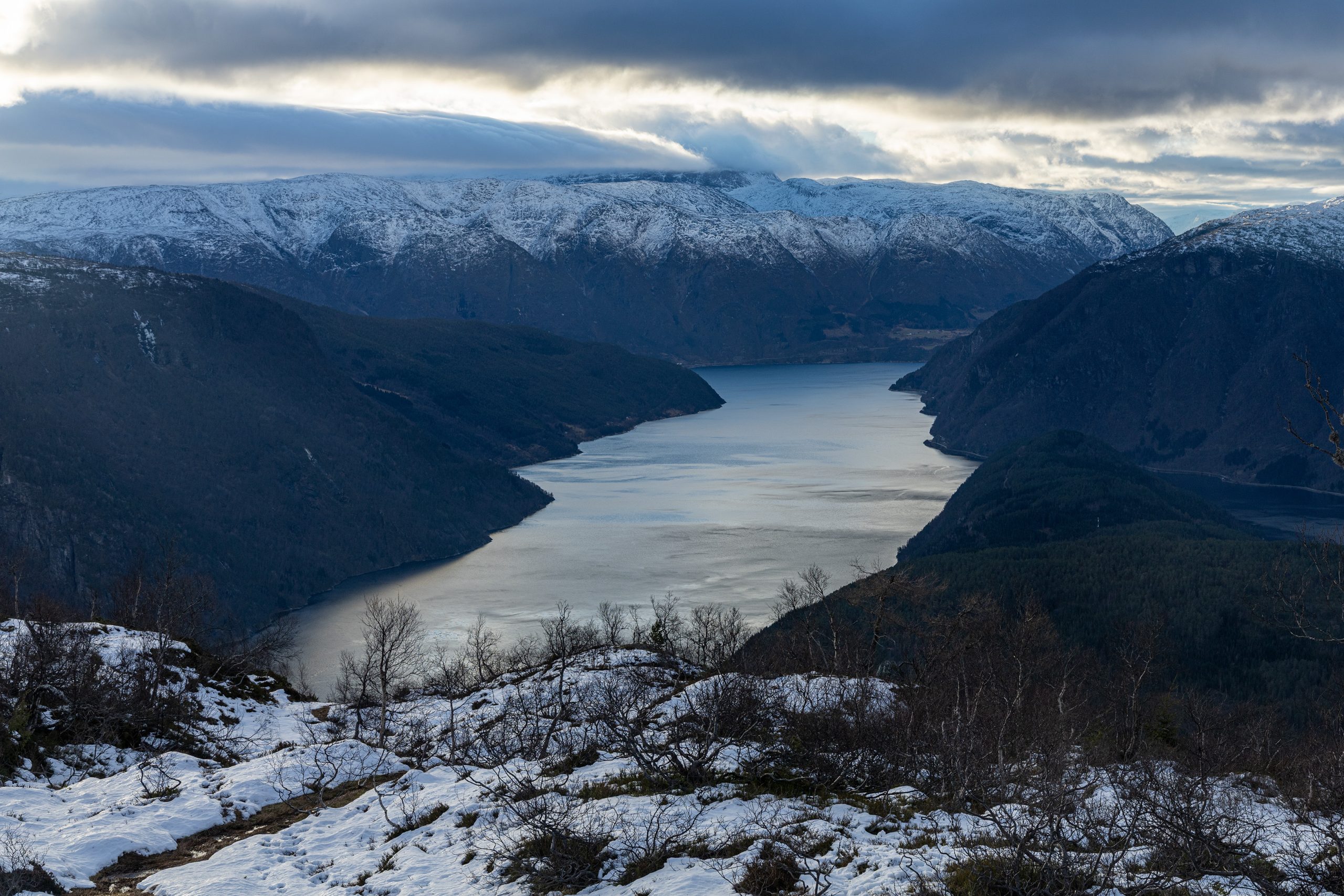 W końcu, udało mi się wejść wyżej. Tam, gdzie kończył się las. Na bardziej otwartą przestrzeń. Za plecami rozciągał się taki widok, że aż dech zapierało. Miałem przed oczami ciągnący się w dal Osafjorden, który łączył się gdzieś tam dalej z Hardangerfjordem. Po obu stronach tej wodnej wstęgi wznosiły się strome zbocza gór, pokryte z wierzchu warstwą śniegu. A w dole przycupnięte w zatoce Ulvikafjorden miasteczko Ulvik. Coś pięknego.