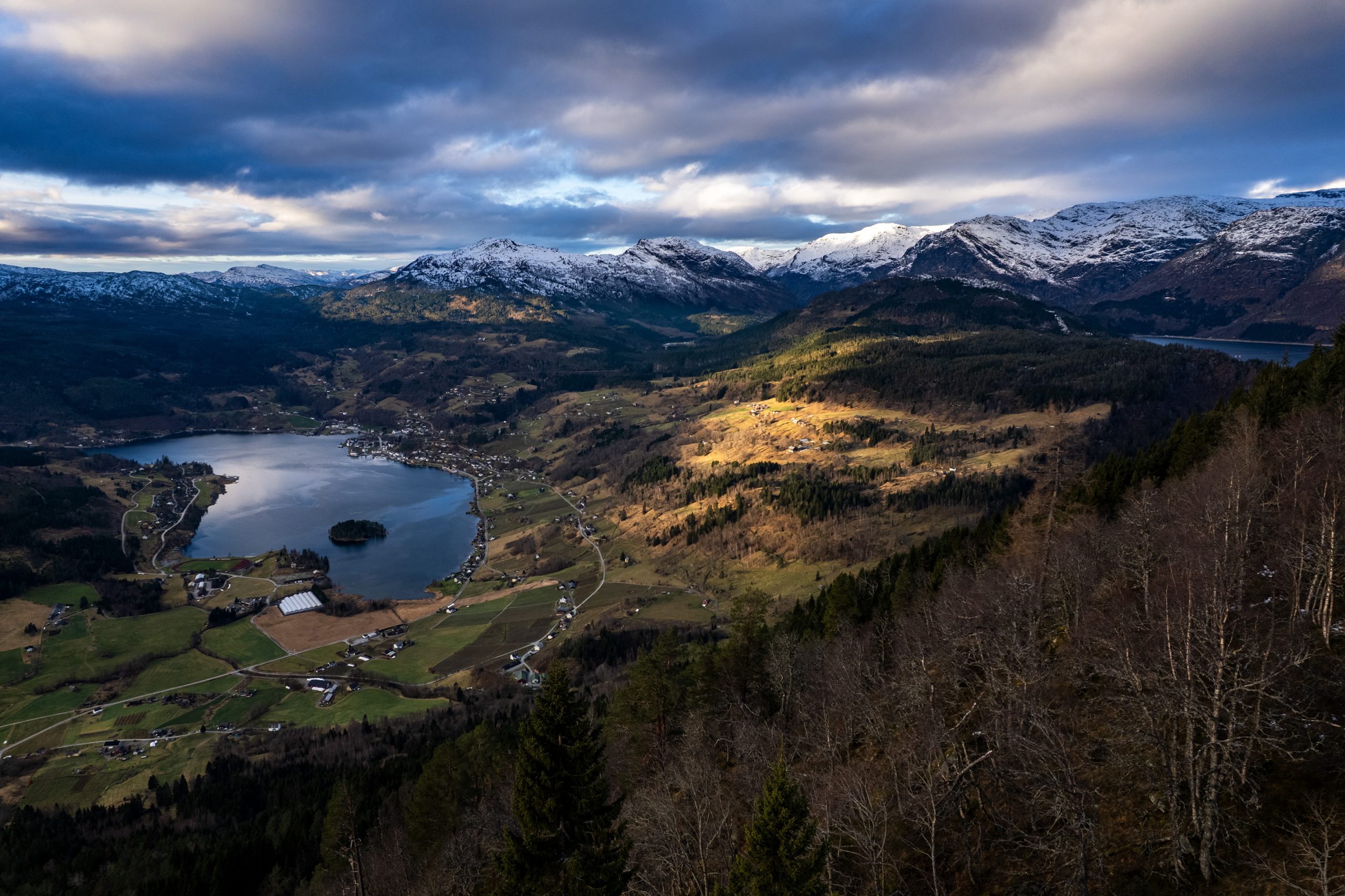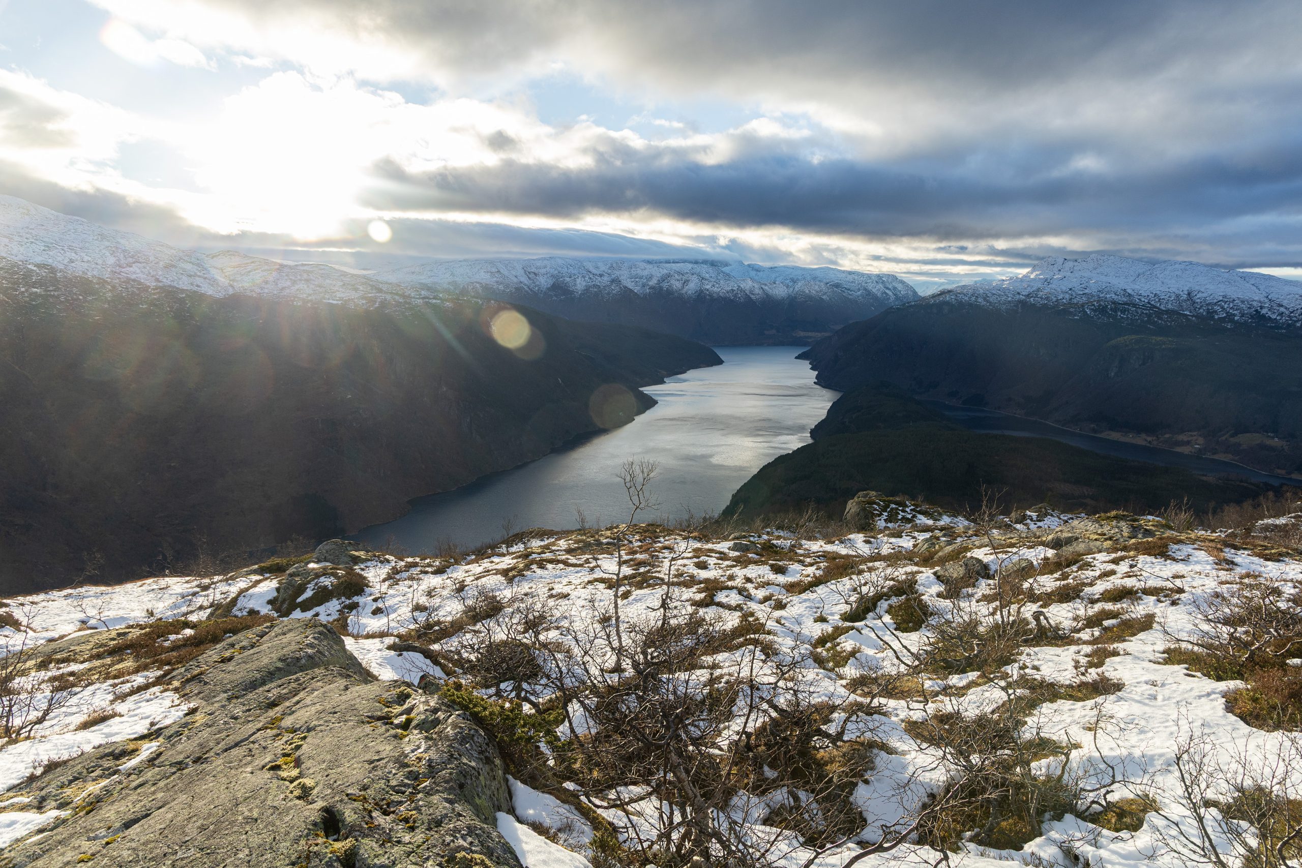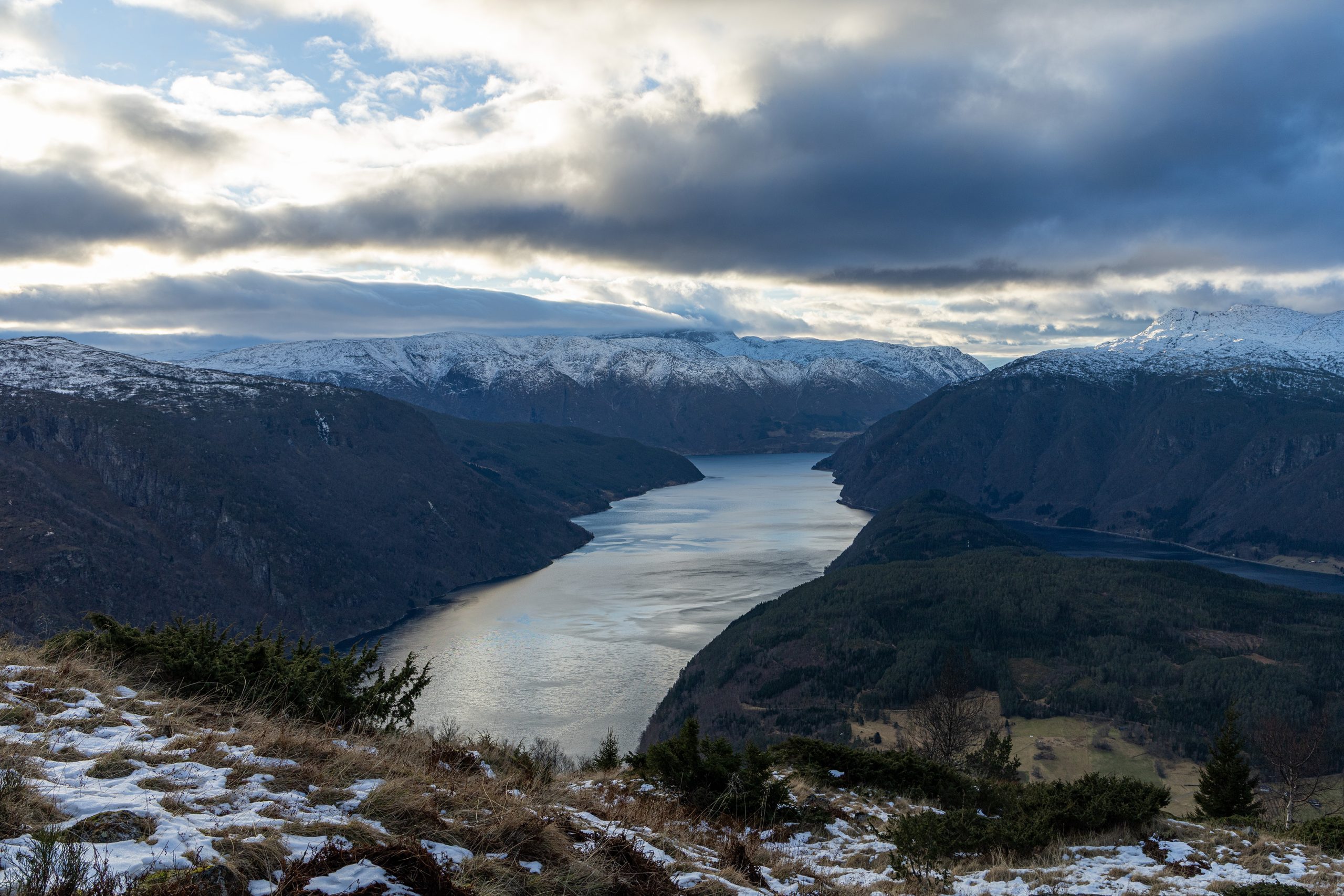 W końcu, udało mi się wejść wyżej. Tam, gdzie kończył się las. Na bardziej otwartą przestrzeń. Za plecami rozciągał się taki widok, że aż dech zapierało. Miałem przed oczami ciągnący się w dal Osafjorden, który łączył się gdzieś tam dalej z Hardangerfjordem. Po obu stronach tej wodnej wstęgi wznosiły się strome zbocza gór, pokryte z wierzchu warstwą śniegu. A w dole przycupnięte w zatoce Ulvikafjorden miasteczko Ulvik. Coś pięknego.
