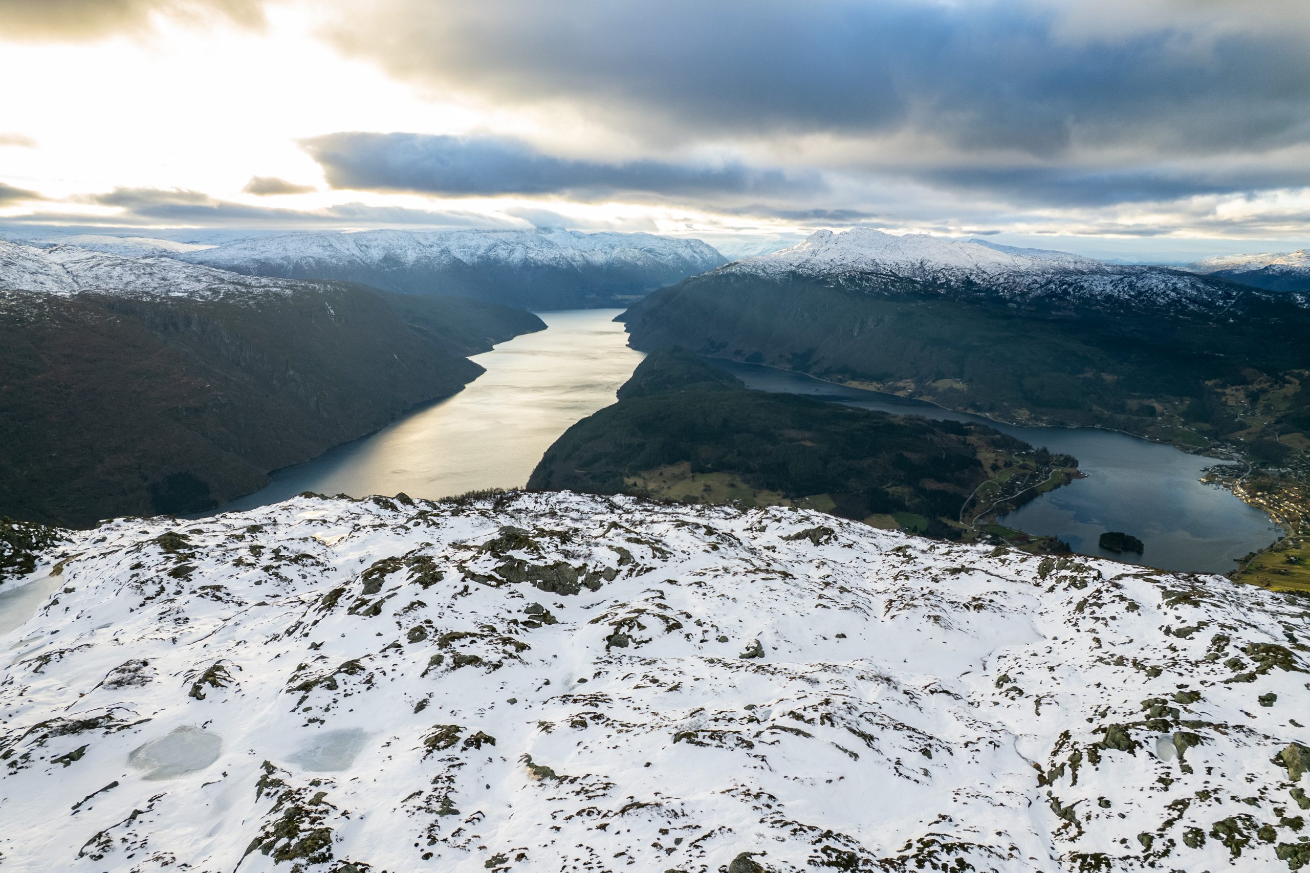 Once there, it turned out that the mountain peaks were already covered with a layer of snow. Who would have guessed? Hello, it’s December after all, I should have planned for this ahead of time. So, I decided to choose a smaller mountain in Ulvik. Kinsarvik and Husedalen were already eliminated from the potential options because, due to the national park boundaries, using a drone wasen’t allowed there.
