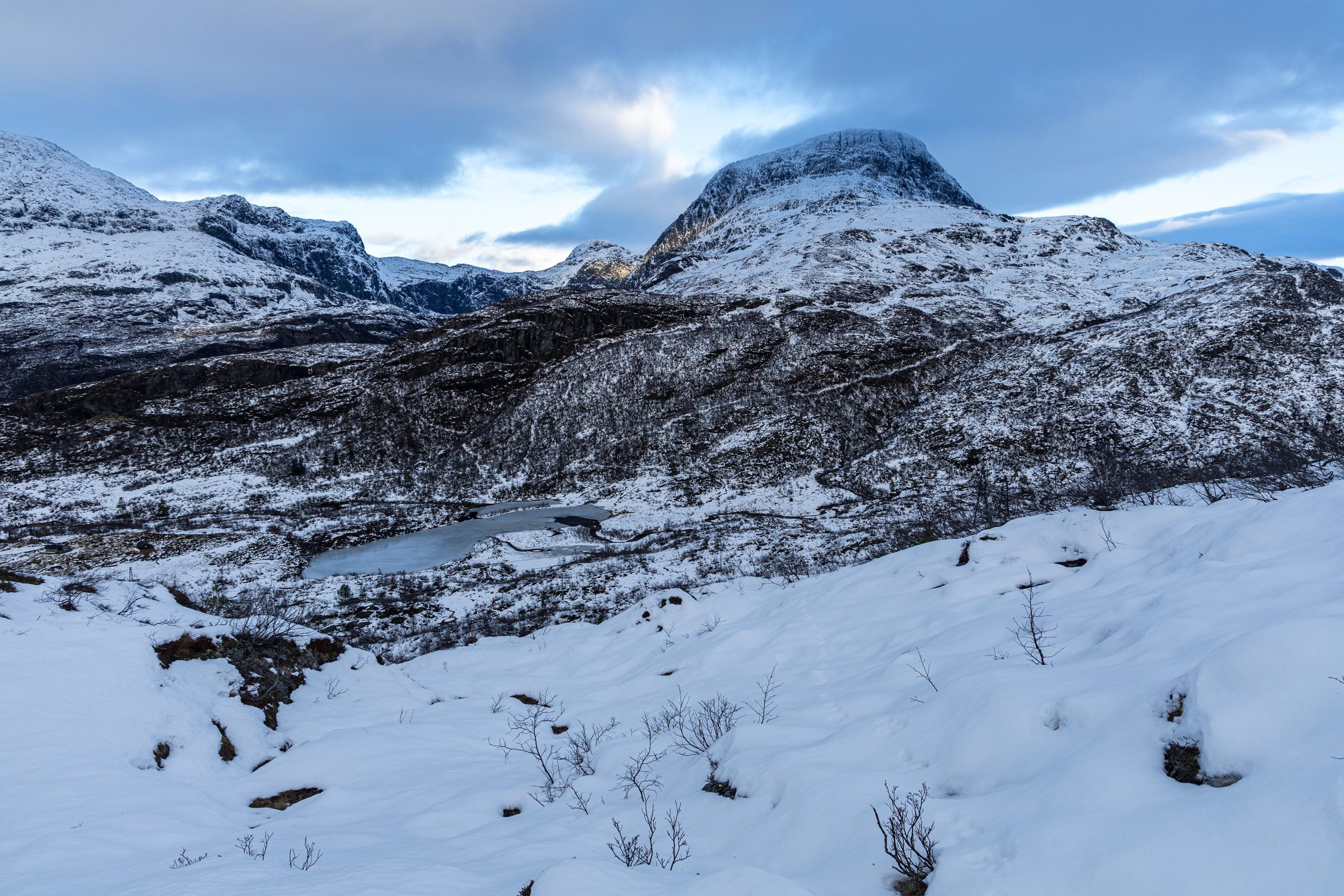 Na tej wysokości leżał już śnieg. Początkowo jeszcze niewiele, ale im wyżej i dalej się posuwałem, było go więcej i więcej. Aż w końcu było go już na tyle dużo, że nie dało się dojrzeć ścieżki. Na szczęście szlak był dobrze oznaczony. Kopczyki kamieni, czerwona farba tu i ówdzie na skale. No i czyjeś ślady, które jak mniemałem, doprowadzą mnie do celu. Z tym ostatnim się pomyliłem. Ślady nie wiodły na szczyt. Gdy się zorientowałem, musiałem odbić nieco i posługując się mapką w telefonie wrócić na szlak. Trasa nie prowadziła na najwyższy punkt, ale mijała go w niewielkiej odległości. Zajęło mi parę minut żeby zajść tam i wrócić (i przy okazji cyknąć kilka fotek i polatać dronem).