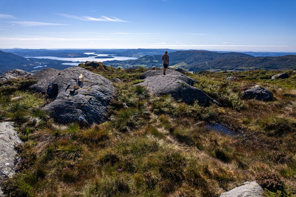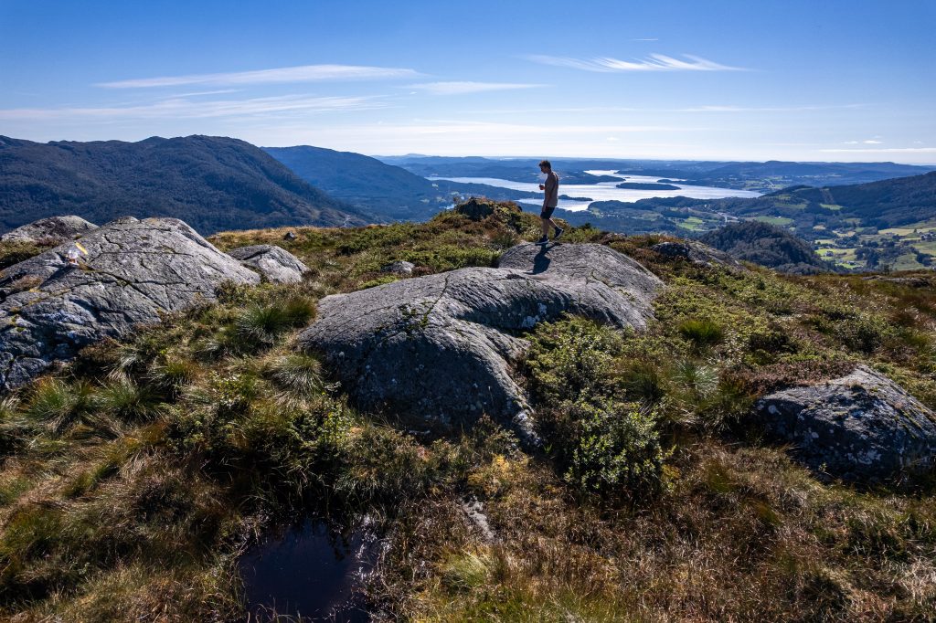 Po jakimś czasie wyszliśmy na otwartą przestrzeń. Było trochę mokro i miejscami trzeba było uważać, gdzie stawia się stopy, ale ogólnie mając już jakieś widoki wokół, szło się raźniej. Dostrzegałem znajome miejsca w oddali. Szczyty Åksla, Vardefjellet, Hovdę. Na południu majaczył masyw ze szczytem Fuglen.