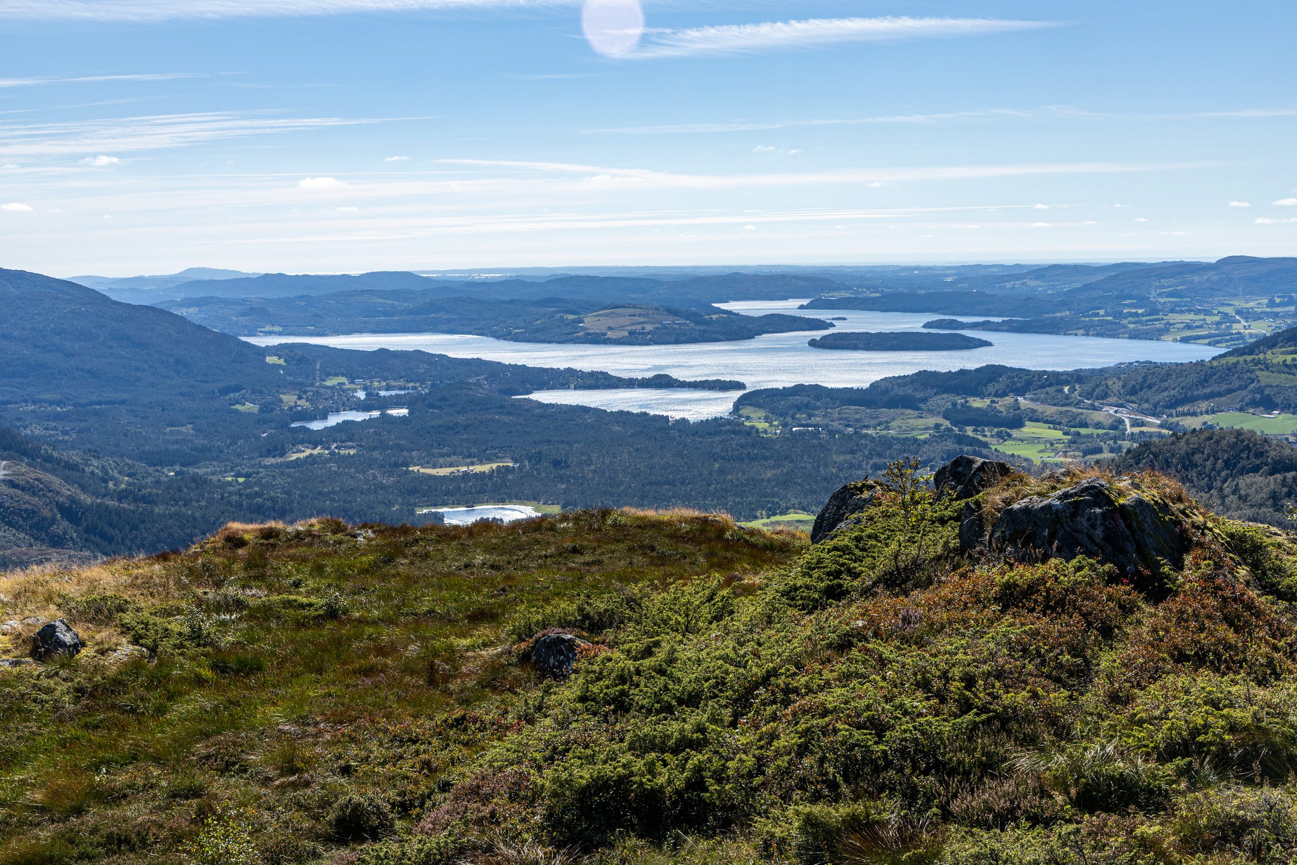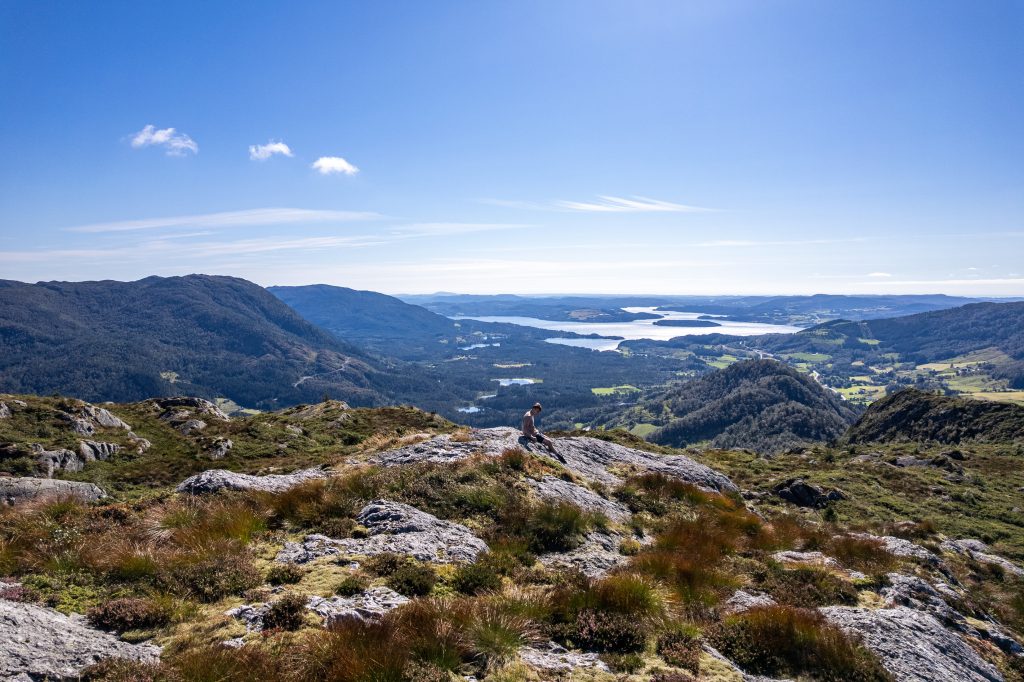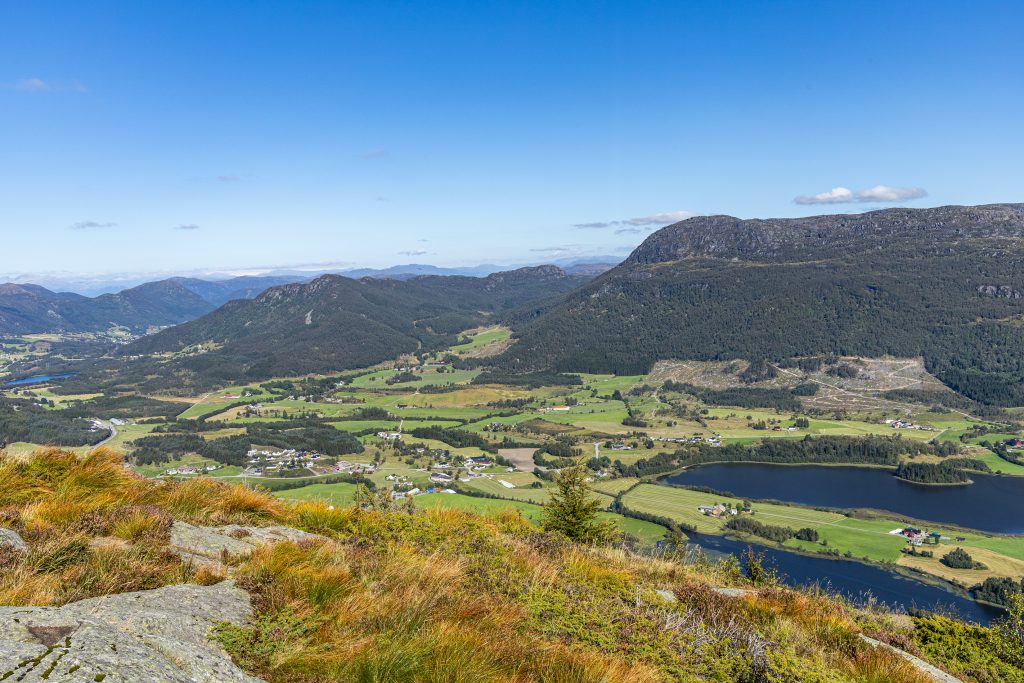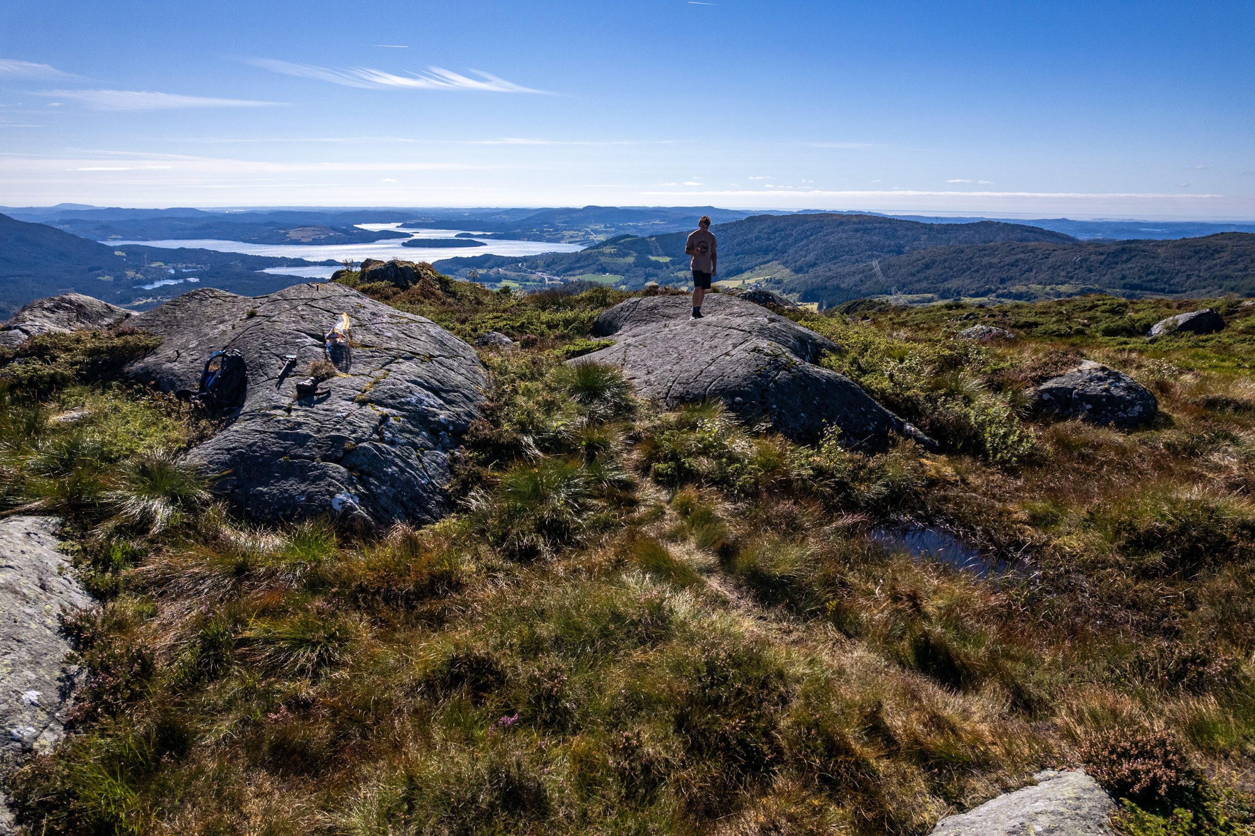 After a while, we emerged into the open area. It was a bit wet, and in places we had to be careful where we placed our feet, but overall, having some views around us made the hike more enjoyable. I spotted familiar places in the distance: the peaks of Åksla, Vardefjellet, Hovda. To the south, the massif with Fuglen loomed.